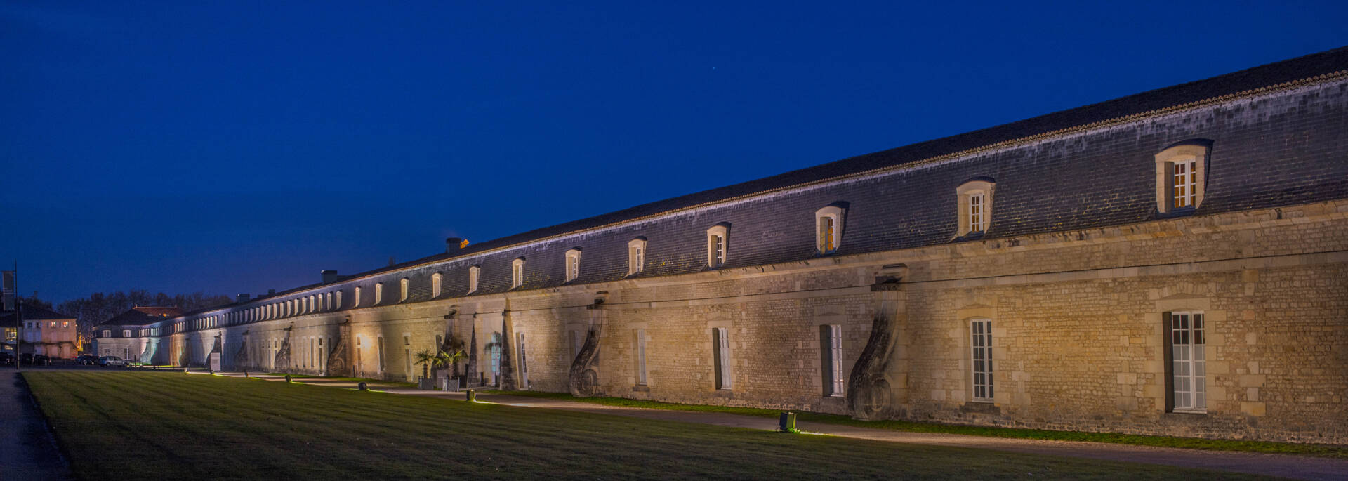 Gehen Sie langsam an der 374 Meter langen Fassade der Königlichen Seilerei entlang, und bewundern Sie die Architektur des prächtigen Bauwerks! Die Seilmanufaktur am Ufer der Charente bietet sich der Sicht der einlaufenden Schiffe und ihrer Mannschaften und wird zum Symbol der Größe und der Macht des Sonnenkönigs. Vom Ufer aus können Sie die klassische Schönheit der Fassade würdigen und von der der Stadt zugewandten Seite ihre nüchterne Einfachheit .