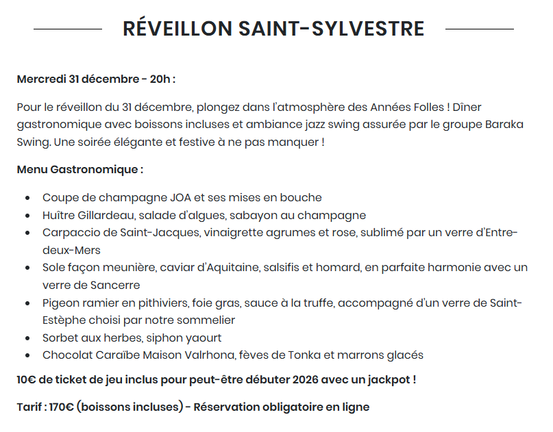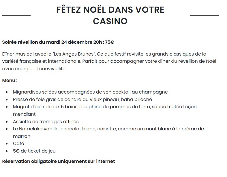 Dans un cadre cosy et chaleureux, le chef vous invite à découvrir une cuisine gourmande et raffinée, élaborée grâce au meilleur des produits de saison. Dès l’arrivée des beaux jours, déjeunez ou dînez sur la nouvelle terrasse et profitez des nombreuses animations : spectacles, soirées à thèmes, dîners dansants... L'entrée du restaurant est indépendante du casino et accessible à toute la famille.